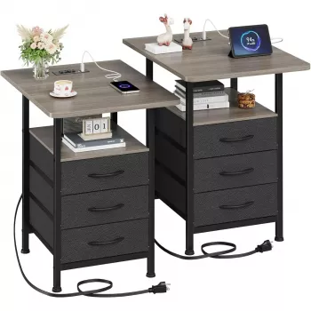 19'' Large Bedside Table Set of 2 with Charging Station and 3 Fabric Drawers